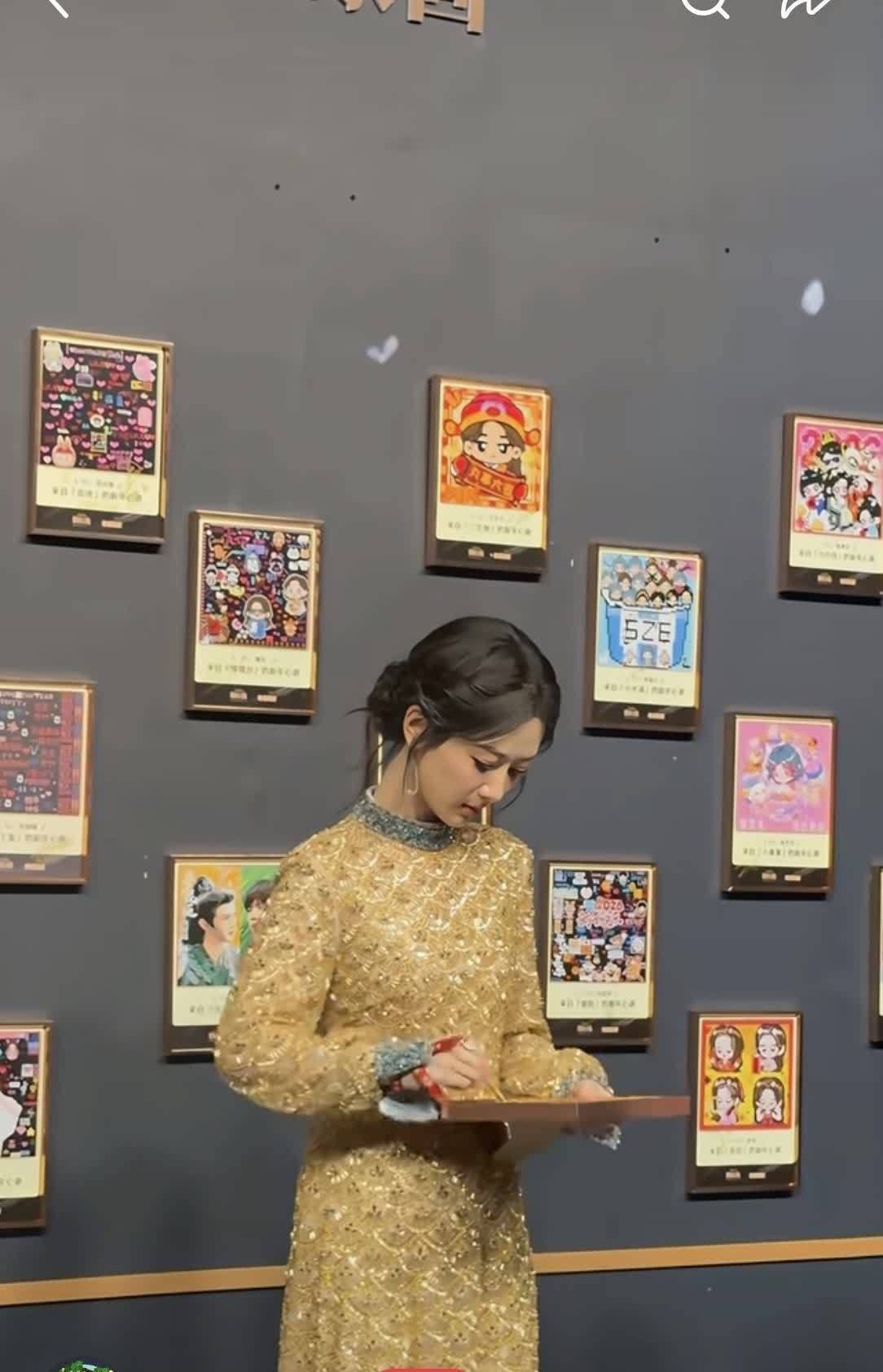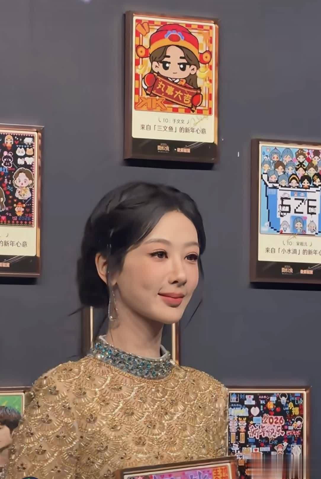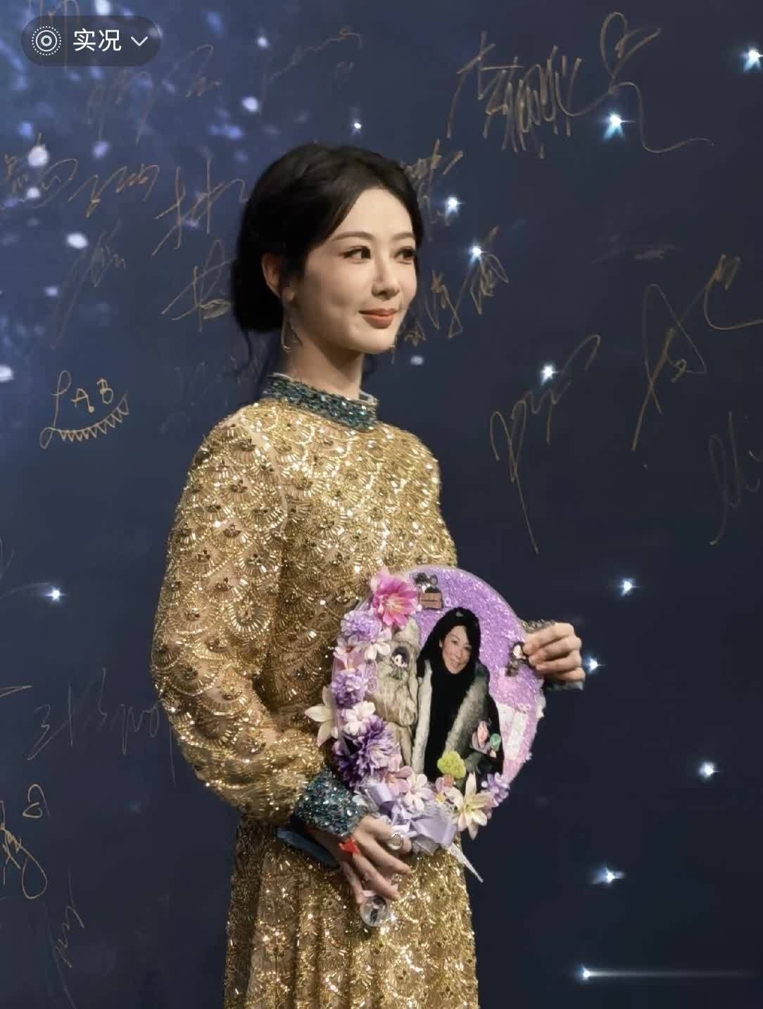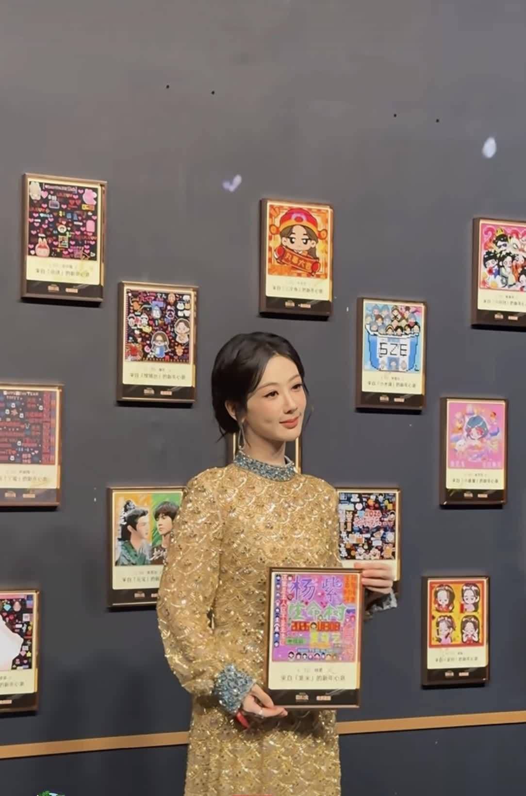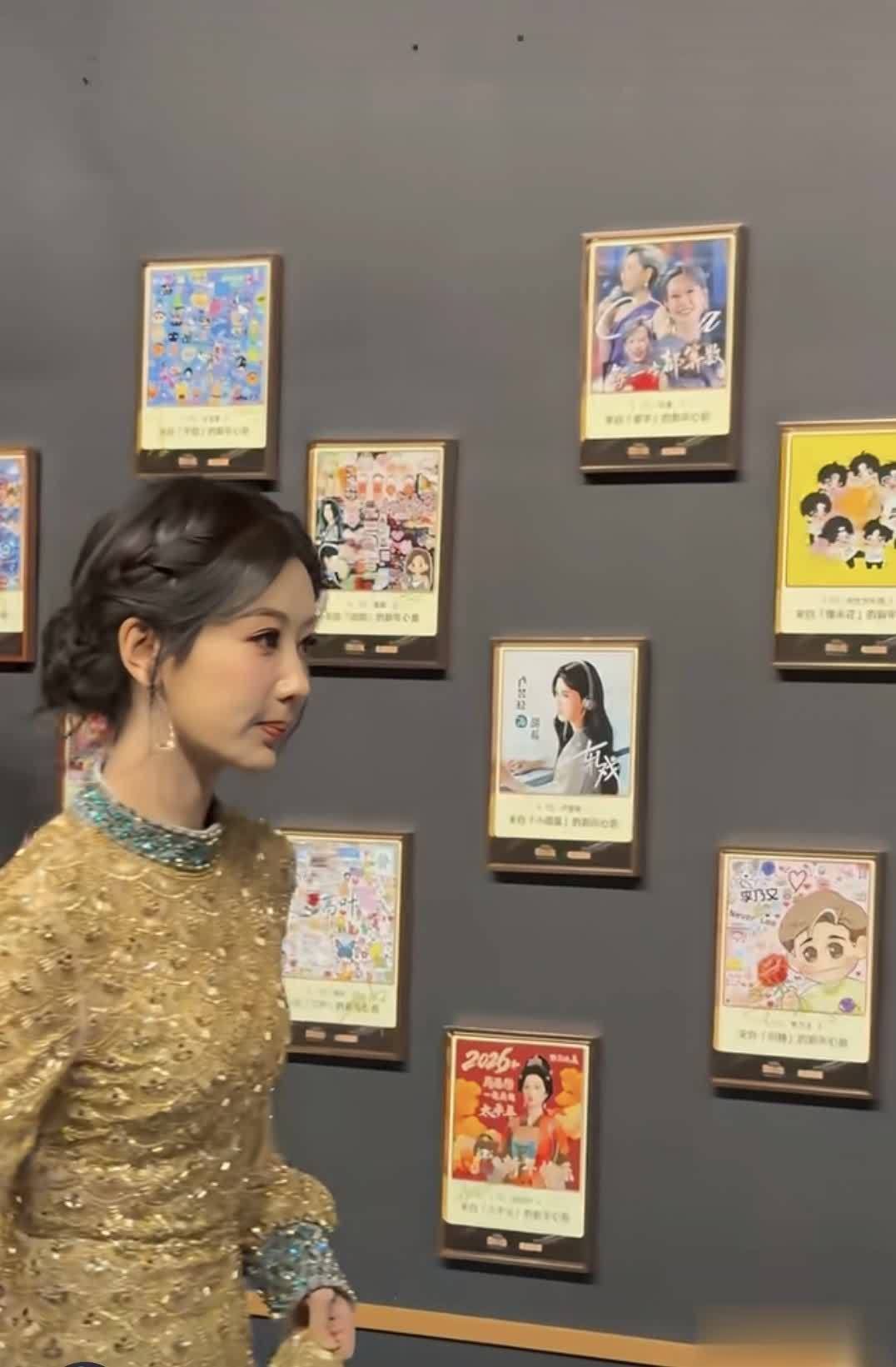微博之夜上,她身着一袭金色亮片长裙,领口镶嵌宝石,头发盘得极为整齐,笑时抿嘴,不露牙齿,全程优雅仿若精致瓷娃娃。